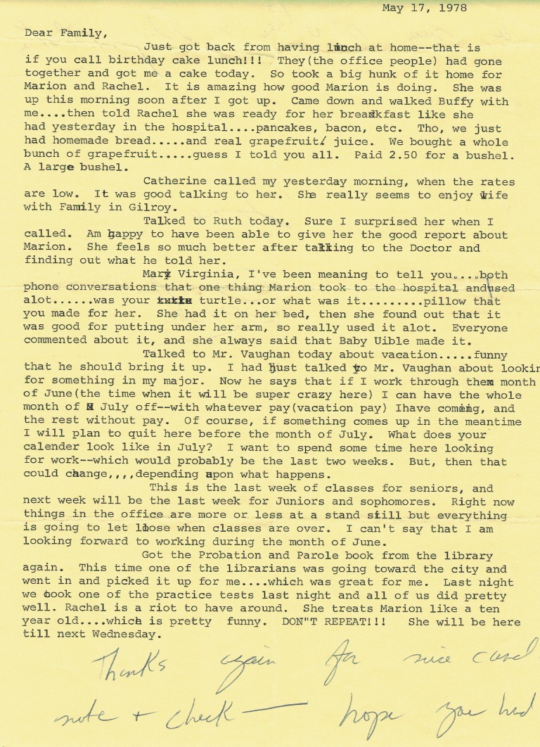 Dear Family,Jut got back from having lunch at home - that is if you call birthday cake lunch!!! They (the office people) had gone together and got me a cake today. So took a big hunk of it home for Marion and Rachel. It is amazing how good Marion is doing. She was up this morning soon after I got up. Came down and walked Buffy with me . . . then told Rachel she was ready for her breakfast like she had yesterday in the hospital . . . pancakes, bacon, etc. Tho, we just had homemade bread . . . and real grapefruit/juice. We bought a whole bunch of grapefruit . . . guess I told you all. Paid $2.50 for a bushel. A large bushel.